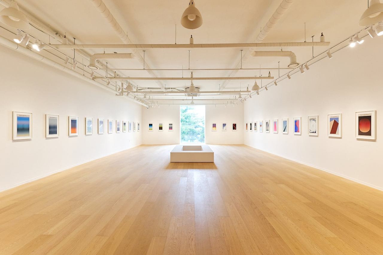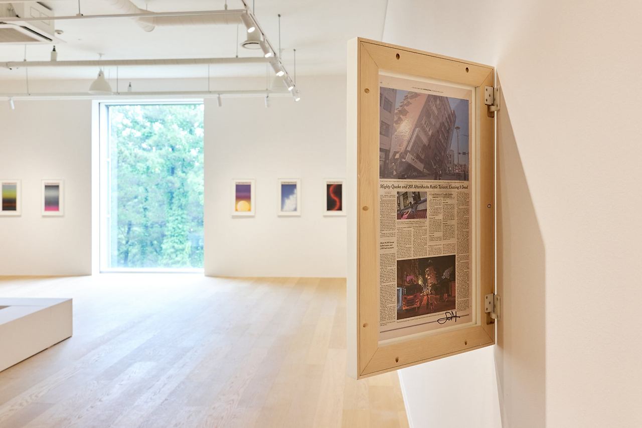 쇼 시부야, 'MANHATTANHENGE' 외 35점. 뉴욕타임스 신문지 위에 그린 작품 36점이 걸렸다. 한쪽 벽에는 전쟁과 참사 기사에서 영감 받은 색면 18점, 마주한 벽에는 같은 날 아침의 고요한 하늘을 그린 18점이 펼쳐진다. / 포도뮤지엄