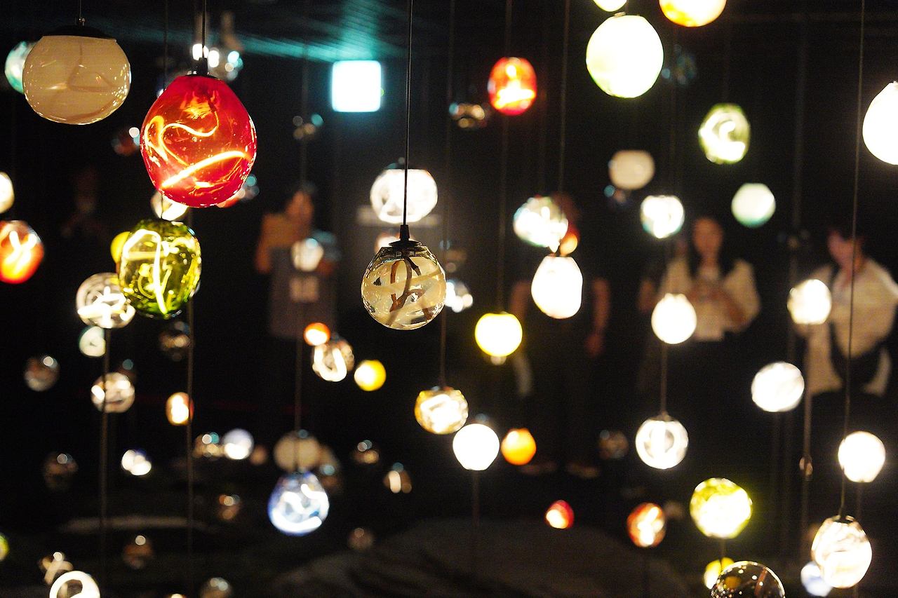 테마공간에 설치된 '유리 코스모스' (2025). 밤하늘을 수놓는 별처럼 수백 개의 유리 전구가 공간을 가득 메우고 있다. 관객이 센서에 숨을 불어넣으면 모든 전구가 차례대로 빛을 발한다. / 포도뮤지엄