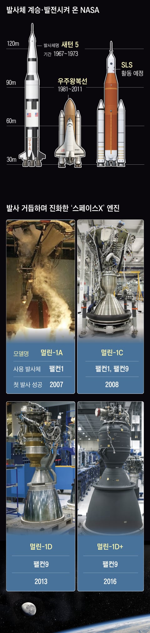 우주왕복선을 위해 개발된 재사용 엔진이 RS-25. 새턴 5 로켓 엔진을 만든 업체 로켓다인 (Rocketdyne)이 다시 RS-25의 제작을 맡았다. 따라서 새턴 5는 로스트 테크놀로지가 아니라 우주왕복선으로 계승된 것이다. 그러나 발사 비용은 낮아지지 않았다. 오히려 일회용인 새턴 5보다 비쌌다. 비용을 줄이지 못한 NASA는 발사 횟수가 충분해야 재사용 효과를 볼 수 있다고 분석하기도 했다. 그런데 우주왕복선의 RS-25 엔진은 이번 아르테미스 계획에도 사용된다. 아폴로 계획부터 우주왕복선에 참여했던 업체들이 아르테미스 계획까지 이어진 것이다. 우주 산업 생태계를 유지하기 위해서는 긴 호흡이 필요했다. 스페이스X는 이런 토양에서 탄생할 수 있었다.