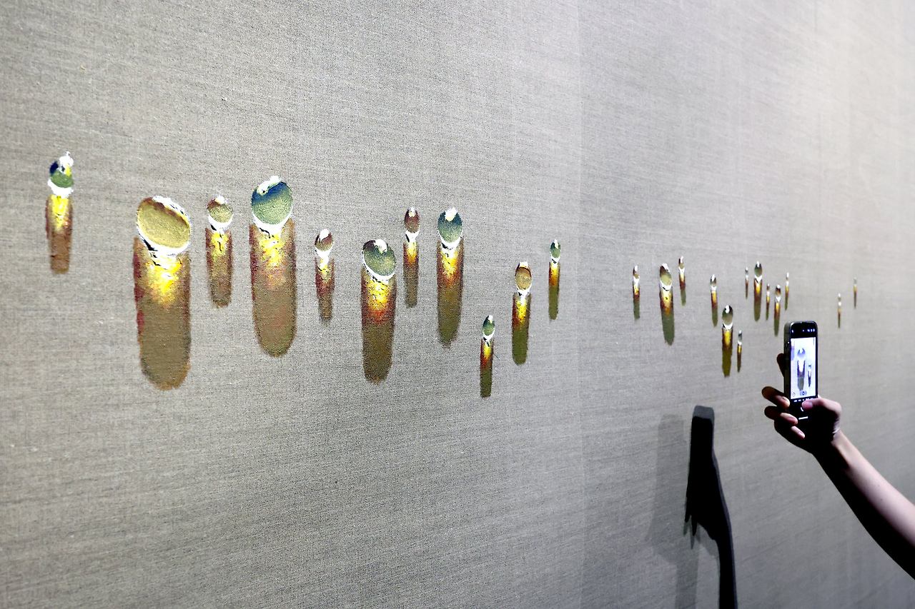 전시장에서 한 관람객이 김창열의 '물방울' 작품을 휴대폰으로 찍고 있다. / 뉴시스