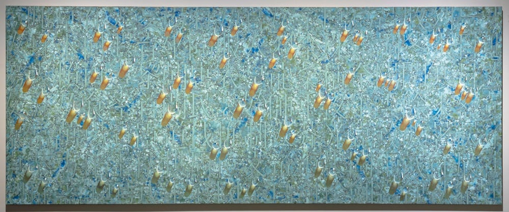 김창열의 2013년 작 ‘회귀’. 천자문 위에 물방울이 영롱하게 맺혀있는 작품이다. 다섯 살 무렵 할아버지에게 천자문을 배운 김창열은 유년 시절 습자지에 글자를 쓰던 기억을 되살리듯 화면을 천자문으로 촘촘히 채우고, 단정한 서체 위에 물방울을 배치했다. 200 × 500cm. 개인 소장. / 국립현대미술관