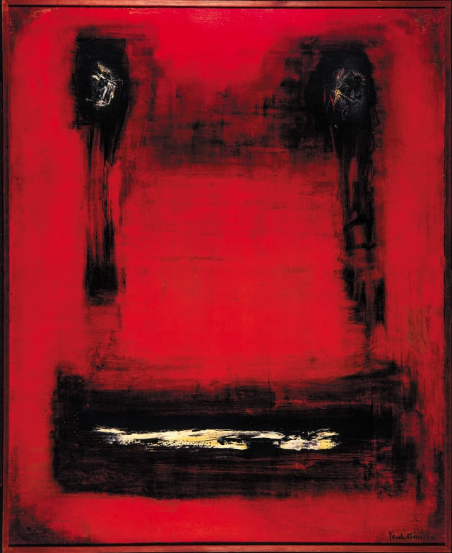 김창열, 1965년작 ‘제사’. 상단에 그려진 두 개의 총알 자국은 마치 눈 같고, 아래의 탱크 바퀴 자국은 입 같아서 눈물을 흘리는 인간의 얼굴처럼 보인다. 162 × 130cm. / 국립현대미술관