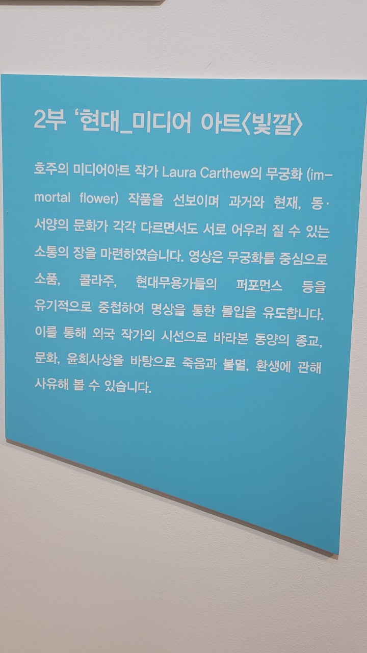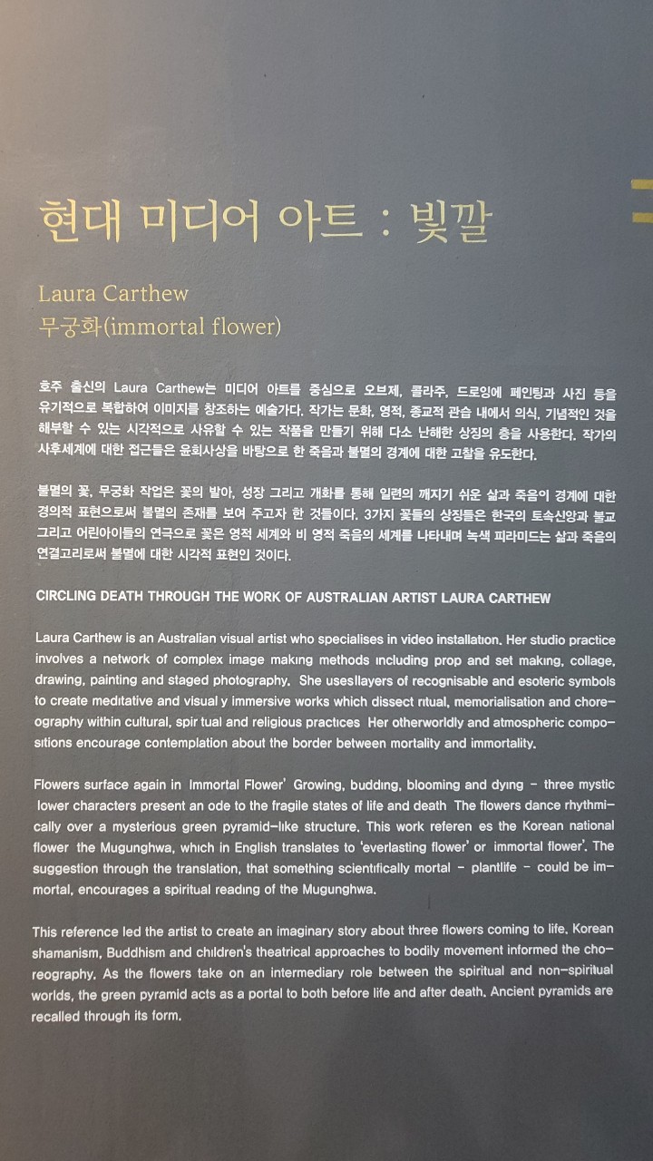 호주의 미디어아트 작가 Laura Carthew의 무궁화(immortal flower) 작품을 선보이며 과거와 현재, 동 · 서양의 문화가 각각 다르면서도 서로 어우러질 수 있는 소통의 장을 마련하였습니다. 영상은 무궁화를 중심으로 소품, 콜라주, 현대무용가들의 퍼포먼스 들을 유기적으로 중첩하여 영상을 통한 몰입을 유도합니다. 이를 통해 외국 작가의 시선으로 바라본 동양의 종교, 문화, 윤회사상을 바탕으로 죽음과 불멸, 환생에 관해 사유해 볼 수 있습니다.