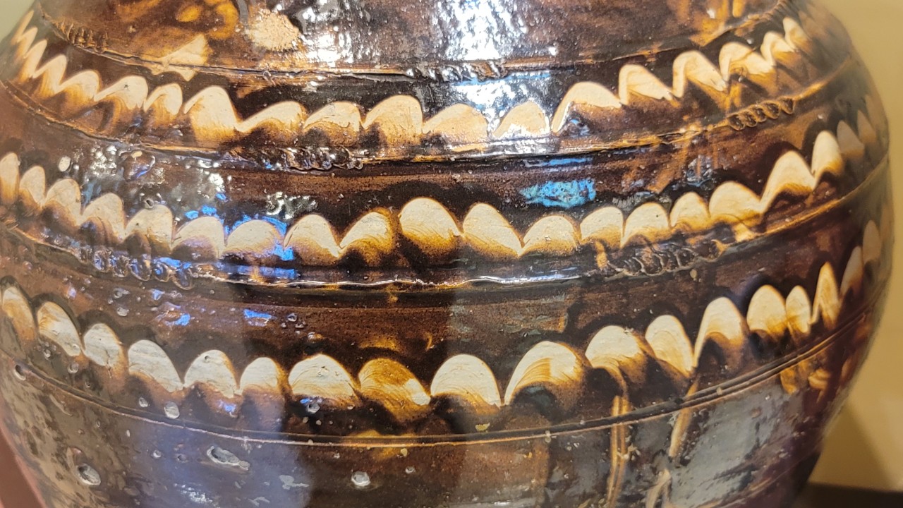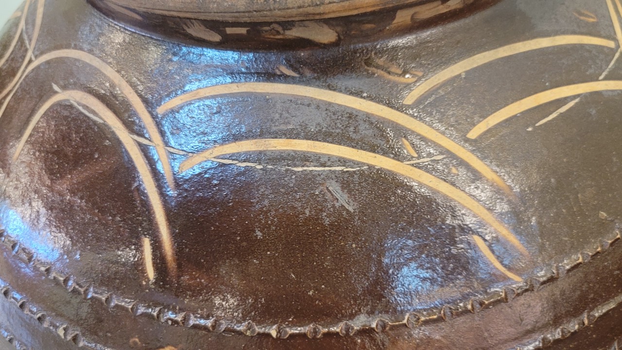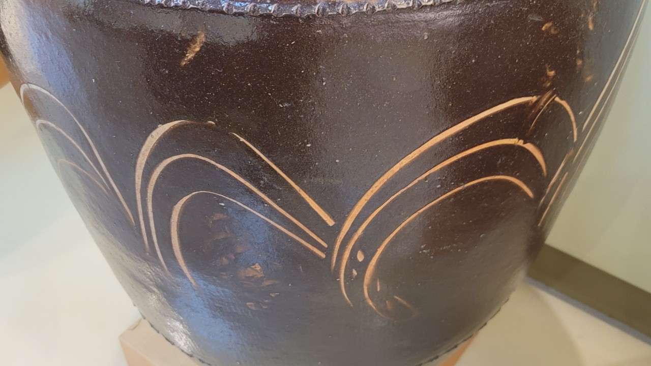 십자가를 쌀미(米)자처럼 표현한 무늬를 넣어 신앙을 드러낸 항아리
