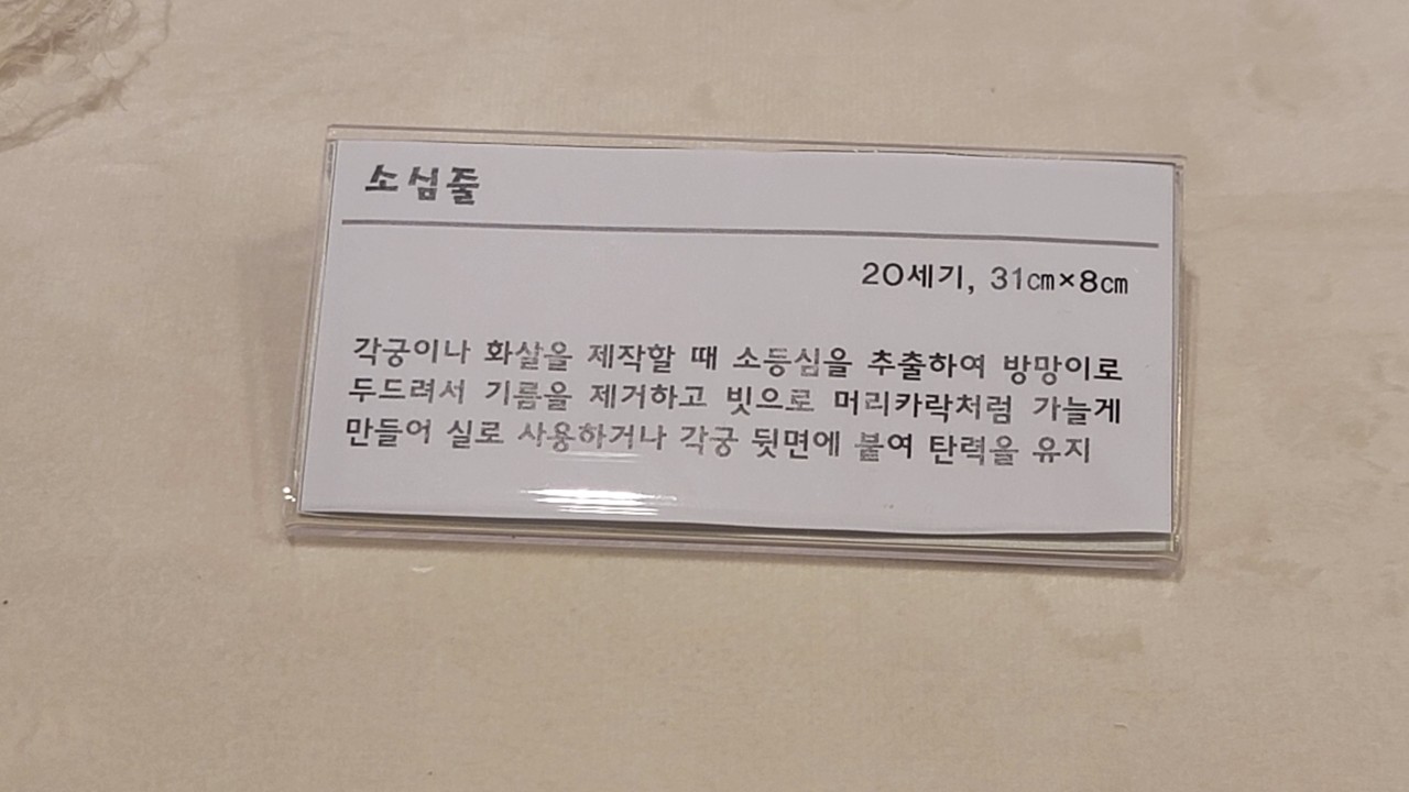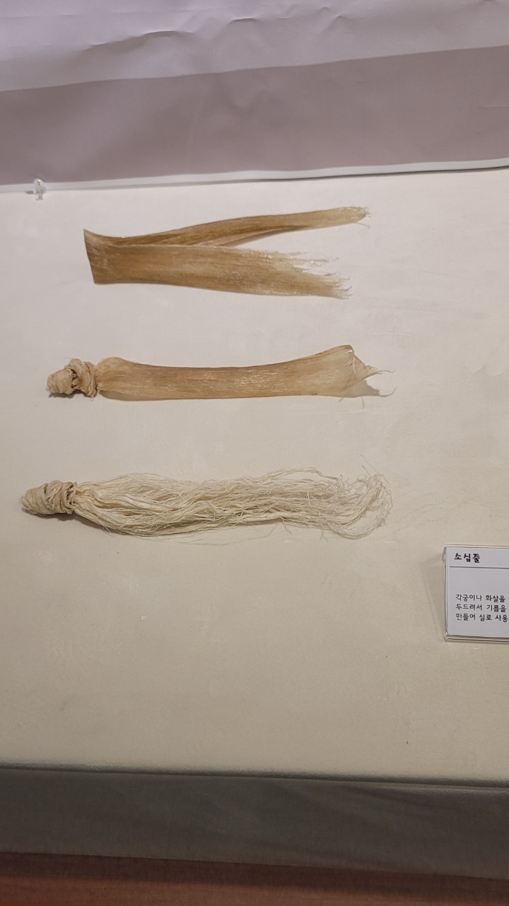 각궁이나 화살을 제작할 때 소등심을 추출하여 방망이로 두드려서 기름을 제거하고 빗으로 머리카락처럼 가늘게 만들어 실로 사용하거나 각궁 뒷면에 붙여 턴력을 유지