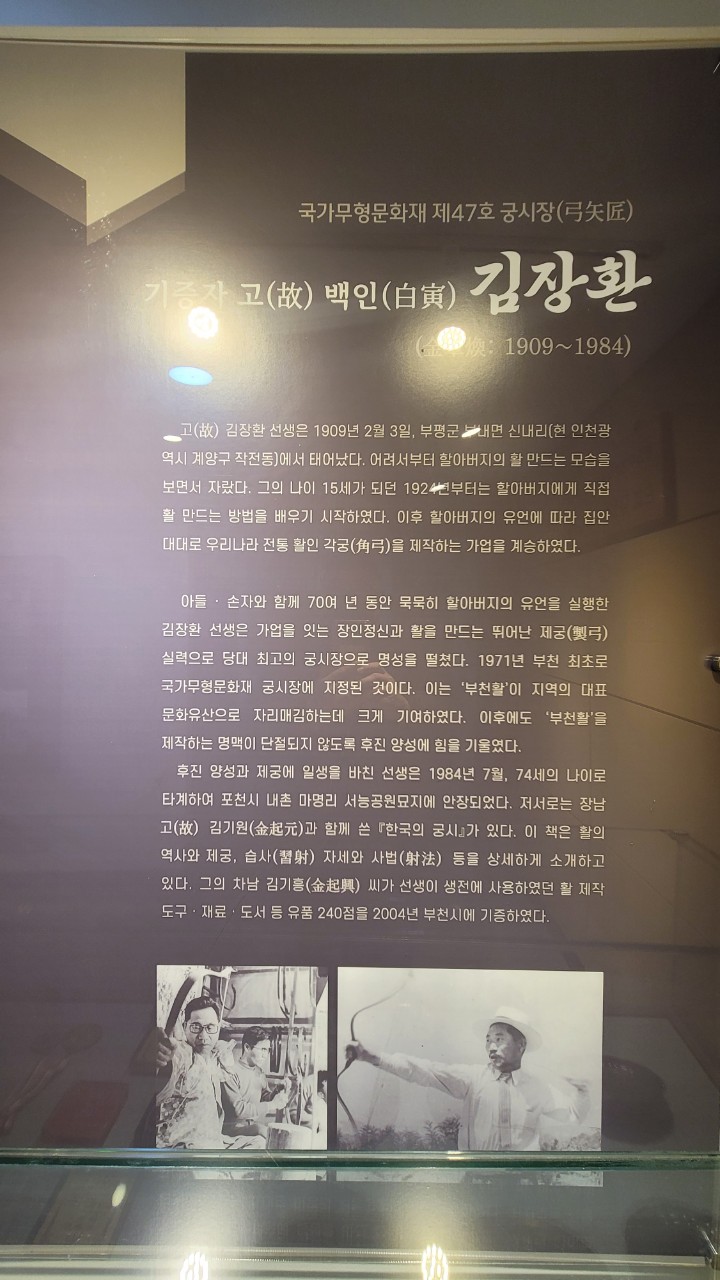아들 · 손자와 함께 70여년 동안 묵묵히 할아버지의 유언을 실행한 김장환 선생은 가업을 잇는 장인정신과 활을 만드는 뛰어난 제궁(製弓) 실력으로 당대 최고의 궁시장으로 명성을 떨쳤다. 1971년 부천 최초로 국가무형문화재 궁시장에 지정된 것이다. 이는 '부천활'이 지역의 대표 문화유산으로 자리매김하는데 크게 기여하였다. 이후에도 '부천활'을 제작하는 명맥이 단절되지 않도록 후진양성에 힘을 기울였다.